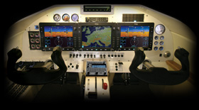 The EA-500 was specifically designed around the Rolls-Royce Model 250-B17F/2 turboprop engine. Weighing just 205 pounds and with power output of 450 shaft horsepower, the engine effectively powers the lightweight, carbon-fiber airframe of the aircraft. The fusion of power and weight results in lower costs per Mile and per Seat than in any other single-engine turboprop aircraft currently available. In fact, the Extra 500 can travel over 1,600 nm In addition, the aircraft is certified for all-weather operations, including Flight Into Known Icing conditions The EA-500’s cockpit features the Avidyne Entegra Release 9 avionics Suite. Entegra Release 9 represents the next generation of integrated flight deck systems for general aviation aircraft.