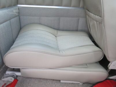 Gray fabric and leather seats with matching side panels carpet and a cream headliner. All in very good condition. Rated 9 out of 10.